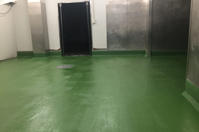 施工出来る時間に限りがある為(加工終了後の夜間のみ)、短時間施工が可能な水系硬質ウレタン床材で床に加え、巾木の施工も行い...