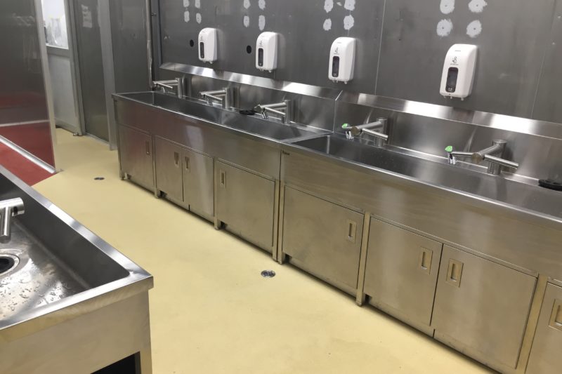 手洗いはサラヤ製のオートソープディスペンサー、dyson製の水栓+ハンドドライヤーを設置。 塗床は耐久性も考慮し。水系硬...