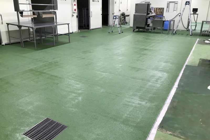 夜間のみの作業条件に合わせて、分割施工を計画しました。 乾燥時間が短く、かつ食品工場の特性を踏まえて低臭性も備えた水系硬...